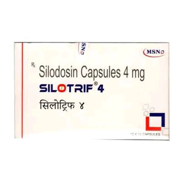 Silotrif 4 Capsule is used to treat the symptoms of an enlarged prostate gland (benign prostatic hyperplasia - BPH) in men. It contains Silodosin, which works by relaxing the muscles of the bladder and prostate gland. This helps in relieving the symptoms of benign prostatic hyperplasia and makes it easier to pass water, thereby increasing urine output and flow. In some cases, it may cause common side effects such as ejaculation disorders (orgasm with reduced or no sperm), dizziness, diarrhoea, stuffy nose (nasal congestion), and orthostatic hypotension (sudden lowering in blood pressure leading to dizziness on standing). Before taking this medicine, you should tell your doctor if you are allergic to any of its components and about all the medications you are taking and pre-existing medical conditions