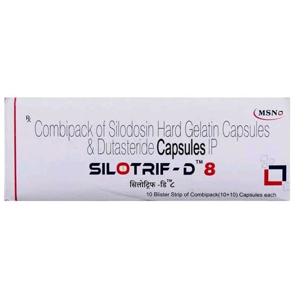 Silotrif-D 8 Capsule is used to treat the symptoms of benign prostatic hyperplasia (BPH) in adults with an enlarged prostate gland. It helps to relieve symptoms such as difficulty urinating or urge to urinate more often and improve your ability to urinate. It contains Silodosin and Dutasteride, which relaxes smooth muscles in the bladder and prostate and shrink of the size of the prostate gland. It reduces the BPH symptoms and improves your ability to urinate. In some cases, you may experience certain common side effects such as dizziness, headache, nasal congestion (stuffy nose), and diarrhoea. Before taking this medicine, you should tell your doctor if you are allergic to any of its components or if you are pregnant/breastfeeding, and about all the medications you are taking and pre-existing medical conditions.