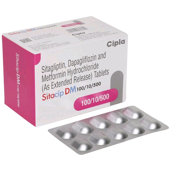 Sitacip DM 10mg/500mg/100mg Tablet is a combination medicine that helps control blood sugar levels. This medicine is used together with diet and exercise to improve blood sugar control in adults with type 2 diabetes mellitus. It helps in proper utilization of insulin, thereby lowering the blood sugar level.