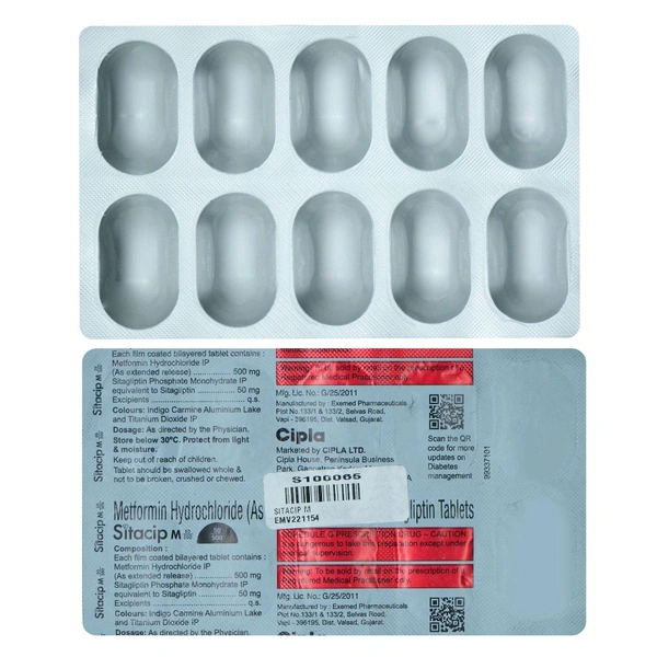 Sitacip M 50mg/500mg Tablet PR is a combination of two medicines that control high blood sugar levels in people with type 2 diabetes mellitus. This helps prevent serious complications of diabetes, such as kidney damage and blindness and may reduce your chances of having a heart attack or stroke.