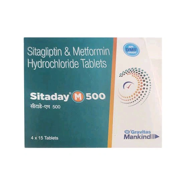 Sitaday M 500 Tablet is used to treat Type 2 diabetes. It contains Sitagliptin and Metformin, which work by increasing the amounts of certain natural substances that lower blood sugar when it is high. Also, it lowers glucose production in the liver, delays glucose absorption from the intestines, and increases the body's sensitivity to insulin. Thus, it controls blood glucose levels from rising to very high after meals. The most common side effect is hypoglycemia (low blood glucose levels), characterised by dizziness, sweating, palpitations, hunger pangs, dry mouth and skin etc. So, to avoid hypoglycemia, you should not miss meals and should also carry some form of sugar with you. Other side effects include taste change, nausea, diarrhoea, stomach pain, headache, and upper respiratory symptoms