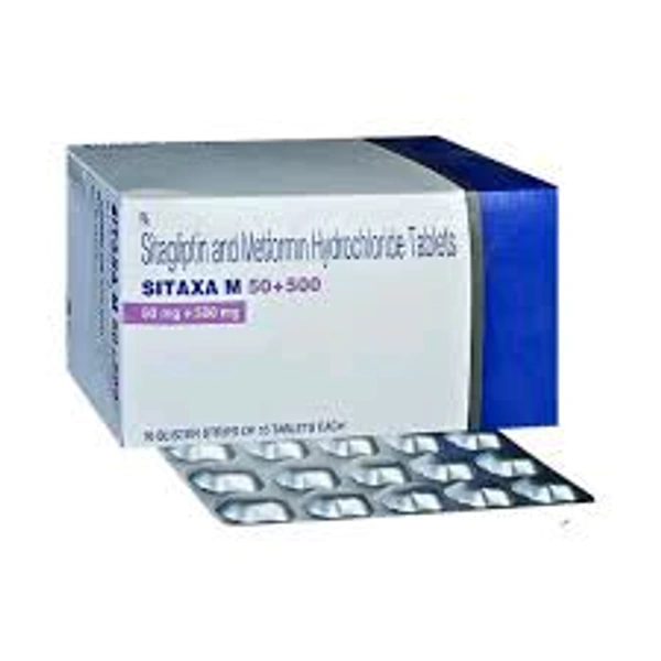 Sitaxa M 50mg/500mg Tablet is a combination of two medicines that control high blood sugar levels in people with type 2 diabetes mellitus. This helps prevent serious complications of diabetes, such as kidney damage and blindness and may reduce your chances of having a heart attack or stroke.