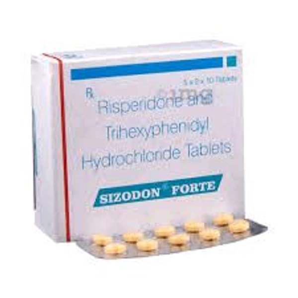 SIZODON FORTE TABLET is used to manage schizophrenia and acute manic episodes, where Risperidone improves mood, thoughts and behavior by decreasing the levels of dopamine and serotonin (chemical messengers) in the brain, and Trihexyphenidyl improves muscle control and reduces stiffness in Parkinson's disease (brain ...