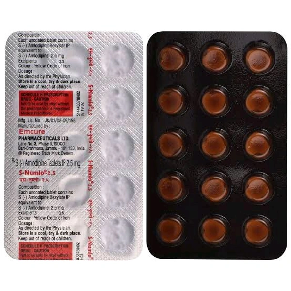 S-Numlo 2.5 Tablet is a medicine used to treat high blood pressure (hypertension) and to prevent angina (heart-related chest pain). It is a calcium channel blocker which helps to lower blood pressure and reduce the workload of the heart. This helps prevent heart attacks and strokes