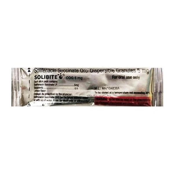 It contains Solifenacin which belongs to the group of medicines called Urinary antispasmodics. It reduces the activity of an overactive bladder and enables you to wait longer before having to go to the bathroom. Try to take SOLIBITE ODG 5MG GRANULES at the same time each day to achieve maximum benefits. It can be taken with or without meals.