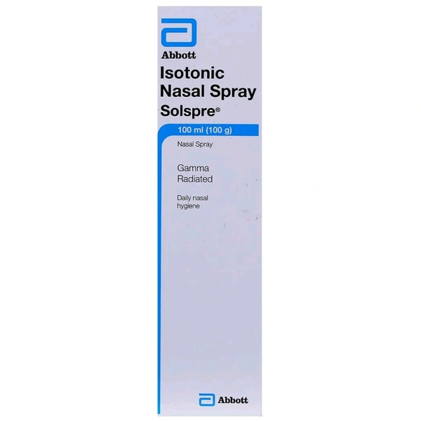 Solspre Nasal Spray is used to treat nasal congestion/stuffy nose, nasal irritation, and dryness of the nasal passages associated with the common cold, flu, pollutants or allergies. It may also be used as a pre-treatment for nasal steroid administration. It contains Sodium chloride that moisturises the nose and helps loosen, soften, and dissolve crusty or thick mucus. In some cases, this medicine may cause side effects such as cough, sneezing, abnormal taste, and stinging sensation in the nose. Before using this medicine, inform the doctor if you are pregnant or breastfeeding, taking any other medication, or have any pre-existing medical conditions.