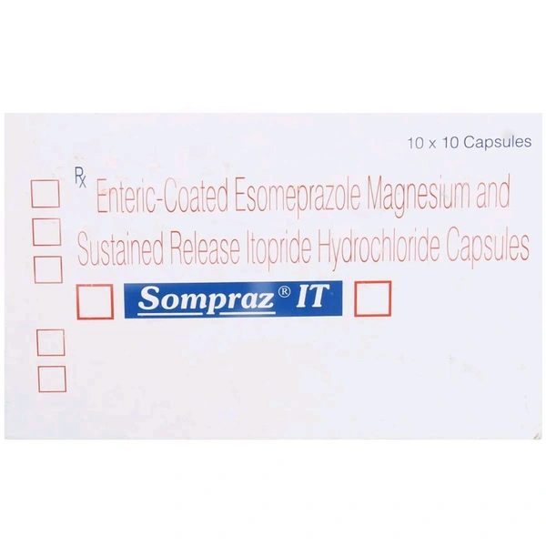 Sompraz IT Capsule is used to treat acidity, gastro-oesophageal reflux disease (GERD), stomach ulcers (peptic ulcers, gastric ulcers due to H pylori), heartburn symptoms and Zollinger Ellison syndrome. It contains Esomeprazole and Itopride, which block the production of stomach acid. Also, it increases the gastric emptying time, thereby improving the movement/motility of the food pipe, stomach, and intestine. In some cases, you may experience certain common side effects, such as headache, flatulence, stomach pain, constipation, and diarrhoea. Before taking this medicine, you should tell your doctor if you are allergic to any of its components or if you are pregnant/breastfeeding, and about all the medications you are taking and pre-existing medical conditions.
