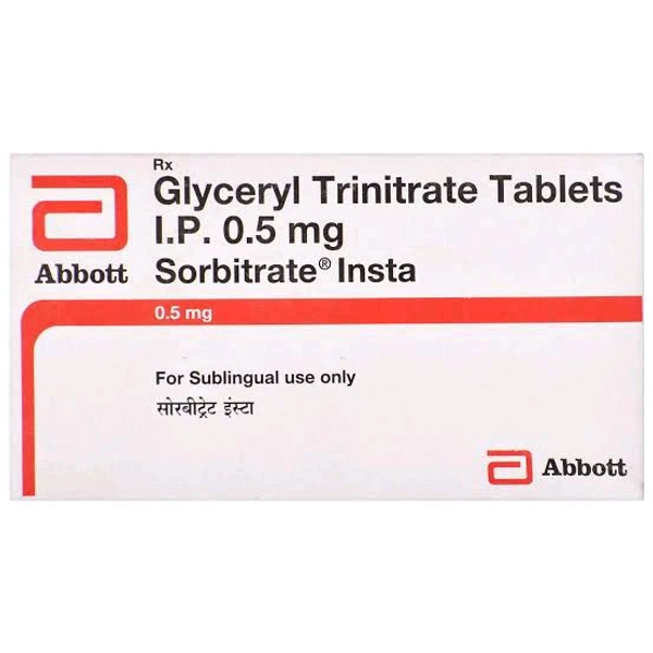 Sorbitrate Insta 0.5 mg Tablet is used to treat Angina (heart-related chest pain). It contains Glyceryl Trinitrate, which works by relaxing the blood vessels and decreasing the oxygen demand the heart requires. As a result, it reduces heart workload and prevents attacks of Angina. Common side effects of Sorbitrate Insta 0.5 mg Tablet may include dry mouth, blurred vision, insomnia, headache, dizziness, weakness, heart palpitations, low blood pressure upon rising from a seated position, nausea and vomiting, sweating, and flushing (warm or red condition of your skin