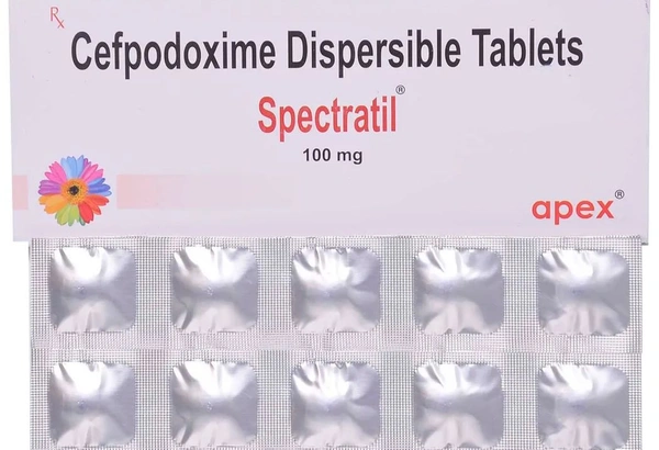Spectratil 100 mg Tablet is used to treat a wide range of bacterial infections of the ear, nose, throat, lower respiratory tract, urinary tract, skin, and soft tissue. It contains Cefpodoxime, which kills the bacteria and helps in treating and preventing the spread of bacterial infections. In some cases, it may cause side effects such as nausea, vomiting, diarrhoea (watery or loose stool), abdominal pain, loss of appetite, bloating, skin rash and itching. Before taking this medicine, you should tell your doctor if you are allergic to any of its components or if you are pregnant/breastfeeding, and about all the medications you are taking and pre-existing medical conditions.