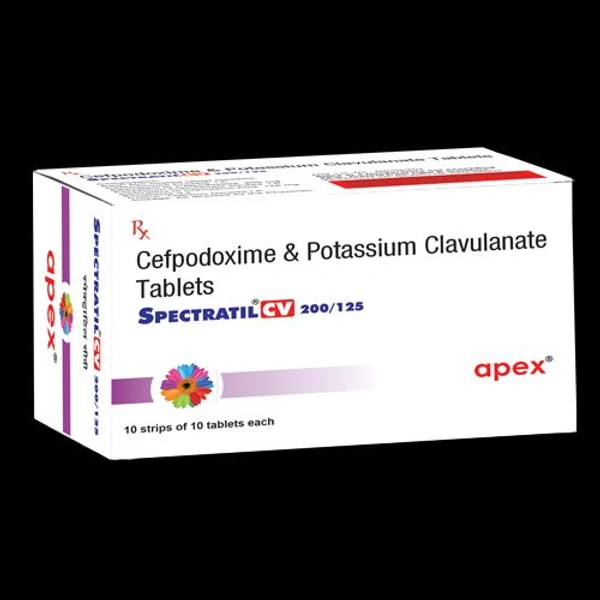 Spectratil CV 200 mg/125 mg Tablet is an antibiotic medicine used in the treatment of bacterial infections such as pharyngitis/tonsillitis, otitis media, sinusitis, community-acquired pneumonia, gonorrhoea, anorectal infections in women, skin, and urinary tract infections. This medicine contains cefpodoxime and clavulanic acid which works by inhibiting the protein synthesis of the bacterial cell and thereby helps fight infection-causing bacteria. This medicine is not effective for treating viral infections. Common side effects include nausea, vomiting, stomach pain, loss of appetite, dizziness, and headache.