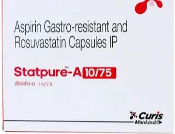 Statpure A 10/75 mg Capsule is used to prevent myocardial infarction (heart attack), stroke or peripheral vascular disease. It is also used to lower abnormally elevated cholesterol or fat levels (hyperlipidaemia or dyslipidaemia) in the body. It contains Rosuvastatin and Aspirin, which lowers the bad cholesterol (low-density lipoprotein or LDL) levels and increases good cholesterol levels (high-density lipoprotein or HDL) in the blood. Also, it decreases the formation of blood clots by preventing the platelets from clubbing together. It may cause common side effects such as increased bleeding tendency, nausea, abdominal pain, headache, constipation, muscle pain, weakness, dizziness and indigestion. Before taking this medicine, you should tell your doctor if you are allergic to any of its components or if you are pregnant/breastfeeding, and about all the medications you are taking and pre-existing medical conditions
