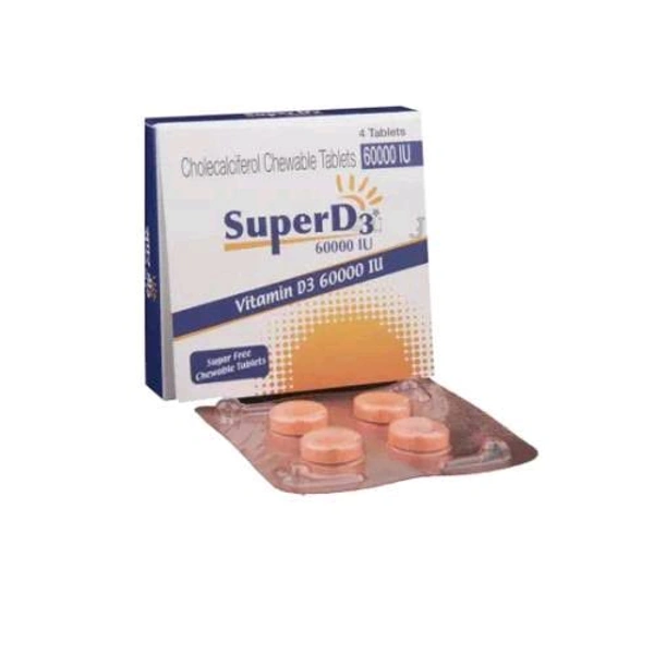 Super D3 60000IU Chewable Tablet is used to treat low blood calcium levels. It effectively treats various conditions in the body like Vitamin D deficiency, osteoporosis, hypoparathyroidism, latent tetany and rickets or osteomalacia. Super D3 60000IU Chewable Tablet contains cholecalciferol (vitamin D3).