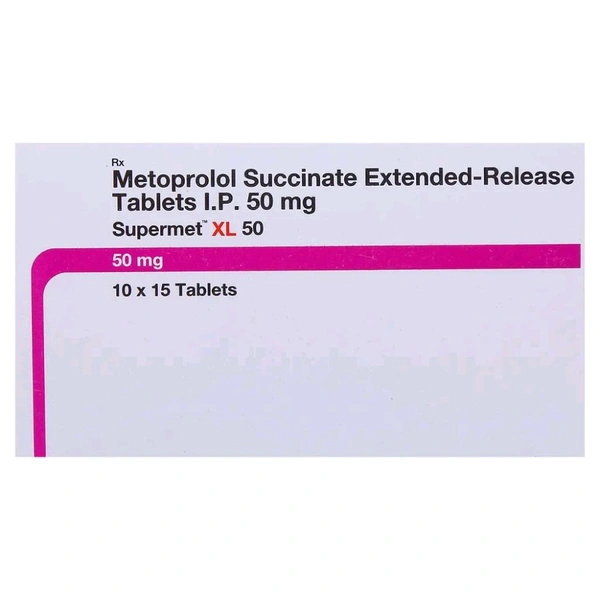 Supermet XL 50 Tablet is used to treat high blood pressure (hypertension), heart-related chest pain (angina), irregular heart rhythm (arrhythmia), and to protect the heart after a heart attack (myocardial infarction). Besides this, it may also help in relieving symptoms of migraine-related headache and tremors (fits). It contains Metoprolol, which helps in slowing down the heart rate, making it easier for the heart to pump blood throughout the body. This lowers the blood pressure and helps in reducing the risk of having a stroke, heart attack, or other heart or kidney problems in the future. In some cases, it may cause certain common side effects like dizziness, tiredness, diarrhoea, stomach pain, nausea, and headache. Before taking this medicine, you should tell your doctor if you are allergic to any of its components or if you are pregnant/breastfeeding, and about all the medications you are taking and pre-existing medical conditions.