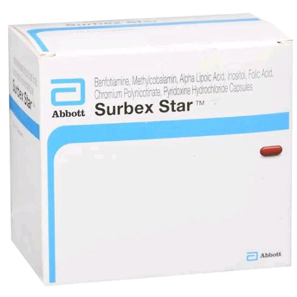 Surbex Star is a nutritional supplement that supplies iron to the blood, vitamins to the body, and ensures that cells, nerves, muscles, and bones operate normally. It is also used to treat or prevent vitamin deficiency, which can occur as a result of a poor diet, certain illnesses, drunkenness, or pregnancy.Eicosapentaenoic acid, Docosahexaenoic acid, Alpha-Lipoic acid, Lycopene, Folic acid, Cyanocobalamin, Vitamin B6, Chromium Picolinate, Selenium, Zinc Sulphate, Manganese, and Magnesium are all found in Surbex Gold.