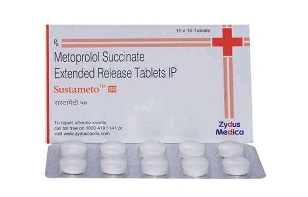 Sustameto 50, which contains Metoprolol, is a beta-blocker used to treat high blood pressure (hypertension), angina (chest pain), and irregular heartbeats (arrhythmia). It also helps prevent migraines, future heart attacks, and strokes. The medication works by slowing down the heart rate, making it easier for the heart to pump blood efficiently, thus reducing blood pressure and strain on the heart.