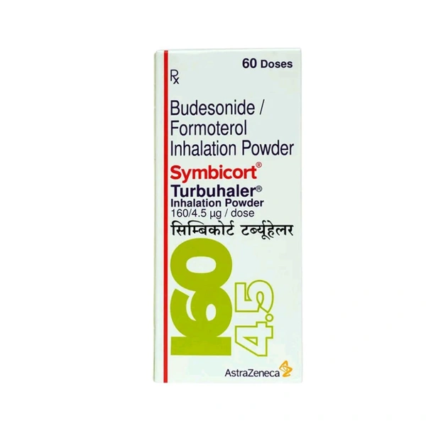 Symbicort 160mcg/4.5mcg Turbuhaler 60 Mdi is used to treat asthma symptoms and chronic obstructive pulmonary diseases (COPD). It contains Budesonide and Formoterol, which works by reducing the irritation and swelling by acting inside the nasal passage and airways lining cells and stopping the release of certain chemicals responsible for causing inflammatory reactions and allergies. Thereby, it provides relief from sneezing, runny or blocked nose and sinus discomfort. Also, it relaxes and widens respiratory airway muscles, making it easier for asthma and COPD patients to breathe. Some people may experience side effects such as fungal infection in the mouth, headache, sore throat, hoarse voice, upper respiratory tract infection, flu, cough, back pain, increased heart rate, and trembling. Before taking this medicine, you should tell your doctor if you are allergic to any of its components or if you are pregnant/breastfeeding, and about all the medications you are taking and pre-existing medical conditions