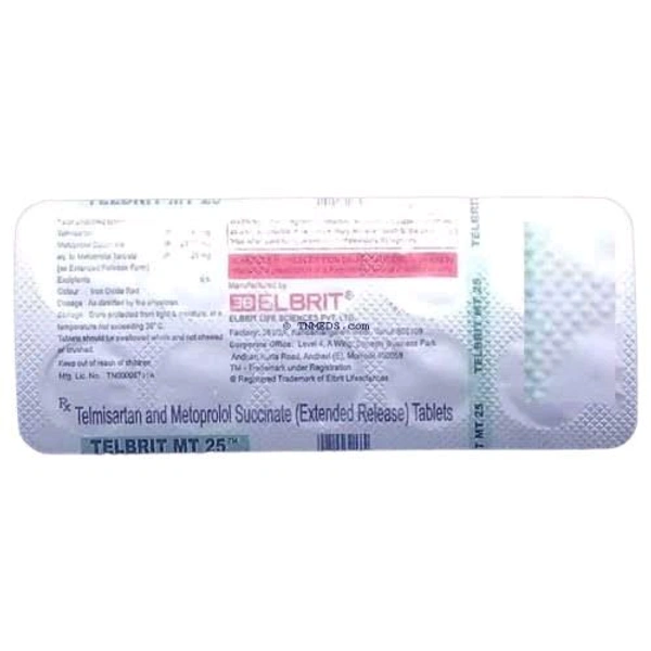 Telbrit MT 25 mg Tablet 15's is used to treat hypertension (high blood pressure). Hypertension is a condition in which the force of the blood against the artery walls is too high. Symptoms include headache, dizziness, nosebleeds, changes in vision, chest pain, weakness, and dyspnea (shortness of breath).