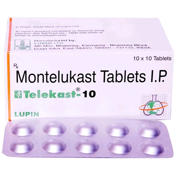 Telekast-10 Tablet is used to treat seasonal allergies and asthma. It contains Montelukast, which reduces inflammation and swelling of airways in the lungs. This makes breathing easier and prevents asthma attacks. In some cases, it may cause common side effects, such as diarrhoea, headache, abdominal cramps, flu-like symptoms, nausea, dizziness, and vomiting. Before taking this medicine, you should tell your doctor if you are allergic to any of its components or if you are pregnant/breastfeeding, and about all the medications you are taking and pre-existing medical conditions