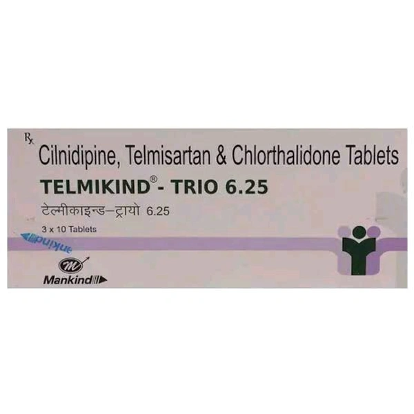Telmikind Trio 6.25 Tablet is used to treat hypertension (high blood pressure) and reduce the risk of heart attack or stroke. It works by relaxing and widening the blood vessels and facilitating the removal of excess water. In some cases, this medicine may cause side effects such as dizziness, headache, low blood pressure, stomach upset, or tiredness. Before taking this medicine, inform the doctor if you are pregnant or breastfeeding, taking any other medication, or have any pre-existing medical conditions.