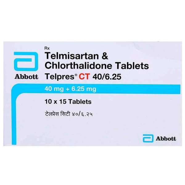 Telpres CT 40/6.25 Tablet is used to treat hypertension (high blood pressure). It contains Telmisartan and Chlorthalidone, which relaxes and widens the blood vessels. Also, it prevents the absorption of excess salt in the body, preventing fluid retention. Thus, it lowers blood pressure and prevents the risk of any future stroke, heart attack, and oedema (fluid retention). In some cases, you may experience dizziness, feeling tired, skin ulcers, diarrhoea, nausea diarrhoea, back pain, and cold/flu symptoms. Before taking this medicine, you should tell your doctor if you are allergic to any of its components or if you are pregnant/breastfeeding, and about all the medications you are taking and pre-existing medical conditions