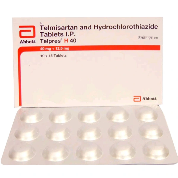Telpres H 40 Tablet is used for the treatment of hypertension (high blood pressure). It contains Telmisartan and Hydrochlorothiazide, which helps to relax and widen the blood vessels (arteries). Also, it prevents absorption of excess salt in the body, preventing fluid retention. Thus, it lowers blood pressure and prevents the risk of stroke, heart attack and oedema (fluid retention). In some cases, you may experience side effects such as dizziness, feeling tired, nausea, diarrhoea, back pain, and cold/flu symptoms. Before taking this medicine, you should tell your doctor if you are allergic to any of its components or if you are pregnant/breastfeeding, and about all the medications you are taking and pre-existing medical conditions.