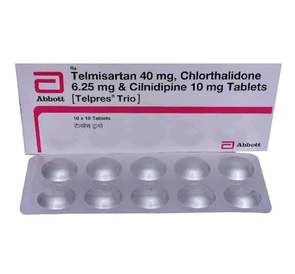 TELPRES TRIO TABLET is used to treat hypertension (high blood pressure) and reduce the risk of heart attack or stroke. It works by relaxing and widening the blood vessels and facilitating the removal of excess water. In some cases, this medicine may cause side effects such as dizziness, headache, low blood pressure, stomach upset, or tiredness. Before taking this medicine, inform the doctor if you are pregnant or breastfeeding, taking any other medication, or have any pre-existing medical conditions.