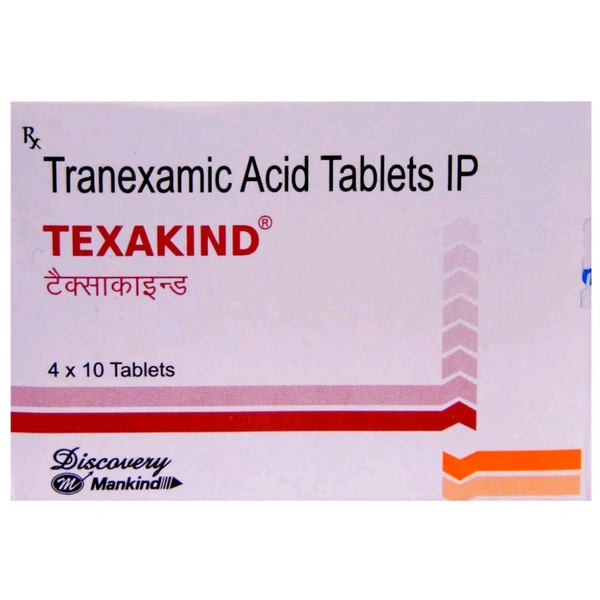 Texakind Tablet is used to treat abnormal or unwanted bleeding. It is used to control bleeding in conditions such as heavy periods (menorrhagia), nose bleeds (epistaxis), cervical surgery (conization of the cervix), prostate surgery (post-prostatectomy), bladder surgery (post-cystectomy), bleeding inside the eye (traumatic hyphaema) and a hereditary disease called angioneurotic edema (HANO). The solution form of this medicine is used before tooth removal (dental extraction) in hemophiliacs (people who bleed more easily than normal). It contains Tranexamic acid, which regulates the breakdown of blood clots. It blocks the release and action of plasmin, an enzyme essential for the breakdown of clots present in the blood. This effect helps to slow down the bleeding. Some patients may experience side effects, such as nausea, diarrhoea, and itchy skin