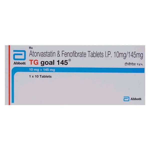 TG Goal 145 Tablet is used in the treatment of high lipid levels (cholesterol and triglycerides levels) and prevention of heart diseases and blood vessel blockage. It contains Atorvastatin and Fenofibrate, which lowers the bad cholesterol (low-density lipoproteins or LDL) and triglycerides (TG) and increases the levels of good cholesterol (high-density lipoproteins or HDL). In some cases, you may experience allergic reactions, hyperglycemia (excess of glucose in the bloodstream), headache, blurred vision, stomach pain, constipation, headaches, joint swelling (oedema), joint pain, muscle pain, back pain, slow heart rate, and nausea. Before taking this medicine, you should tell your doctor if you are allergic to any of its components or if you are pregnant/breastfeeding, and about all the medications you are taking and pre-existing medical conditions.