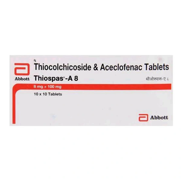 Thiospas-A 8 Tablet is used to reduce and relieve pain due to muscle spasms (painful muscular contractions) associated with degenerative vertebral disorders, vertebral static problems, dorsal pain, low back pain, and torticollis (neck muscle contractions). It contains Thiocolchicoside and Aceclofenac, which relieves muscle stiffness and improves muscle movements, thereby relieving pain due to muscle spasms. It may cause side effects such as diarrhoea, dizziness, nausea, vomiting, stomach pain, or increased liver enzymes in the blood in some cases. Before taking this medicine, you should tell your doctor if you are allergic to any of its components or if you are pregnant/breastfeeding, and about all the medications you are taking and pre-existing medical conditions.