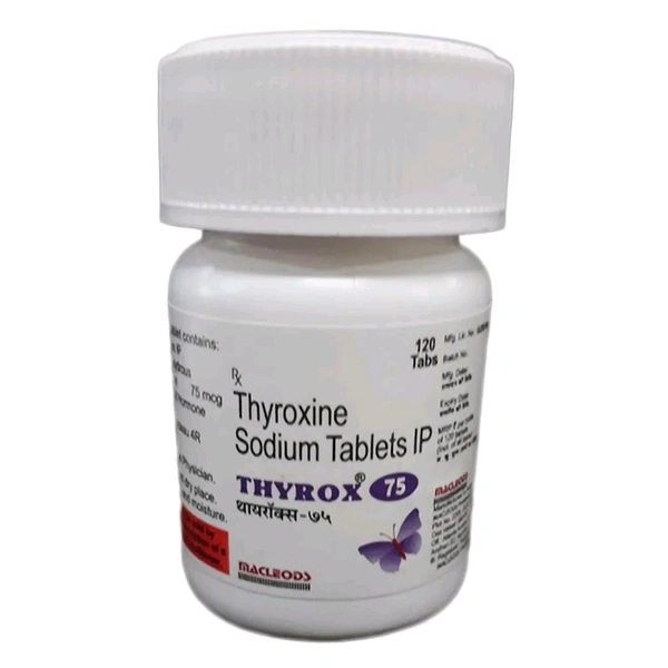 Thyrox 75 mcg Tablet is used to treat hypothyroidism (underactive thyroid). It contains Thyroxine sodium, which replaces or provides more thyroid hormone in the body when the body is unable to naturally produce enough thyroid hormone (Thyroxine) to meet the requirements of the body. Thus, it helps to restore thyroid hormone for proper digestion, muscle functioning, brain development, and maintenance of bones. It may cause side effects such as headache, diarrhoea, nausea, vomiting, sweating, muscle cramps, shaking (usually of hands) and feeling restless or excitable, or problems sleeping. Before taking this medicine, you should tell your doctor if you are allergic to any of its components or if you are pregnant/breastfeeding, and about all the medications you are taking and pre-existing medical conditions.