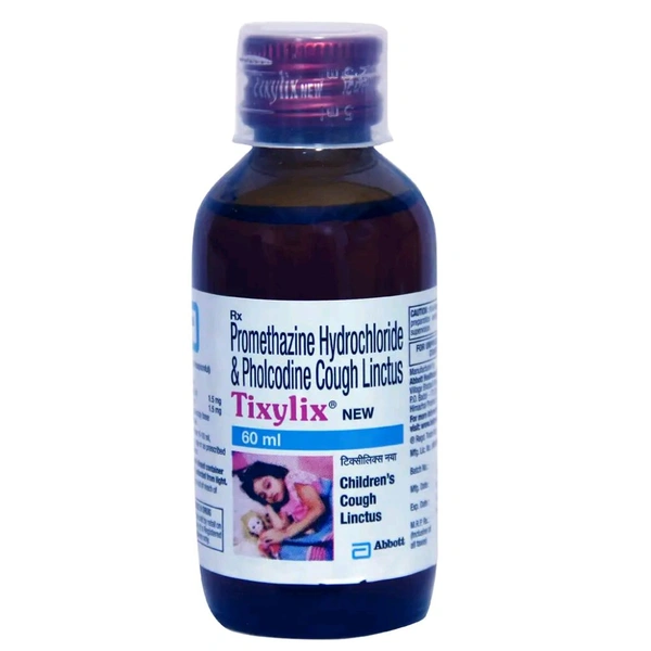 Tixylix New Syrup is used for treating dry cough and allergic symptoms. It contains Promethazine and Pholcodine, which blocks the action of a chemical messenger (histamine), responsible for triggering cough due to allergy. Also, it suppresses cough by reducing the activity of the cough centre in the brain. Sometimes, you may experience side effects such as nausea, vomiting, constipation, sleepiness, dizziness, confusion, and breathlessness. It is advised to drink plenty of fluids while taking this medicine to overcome dry mouth and extreme thirst. Before taking this medicine, you should tell your doctor if you are allergic to any of its components or if you are pregnant/breastfeeding, and about all the medications you are taking and pre-existing medical conditions