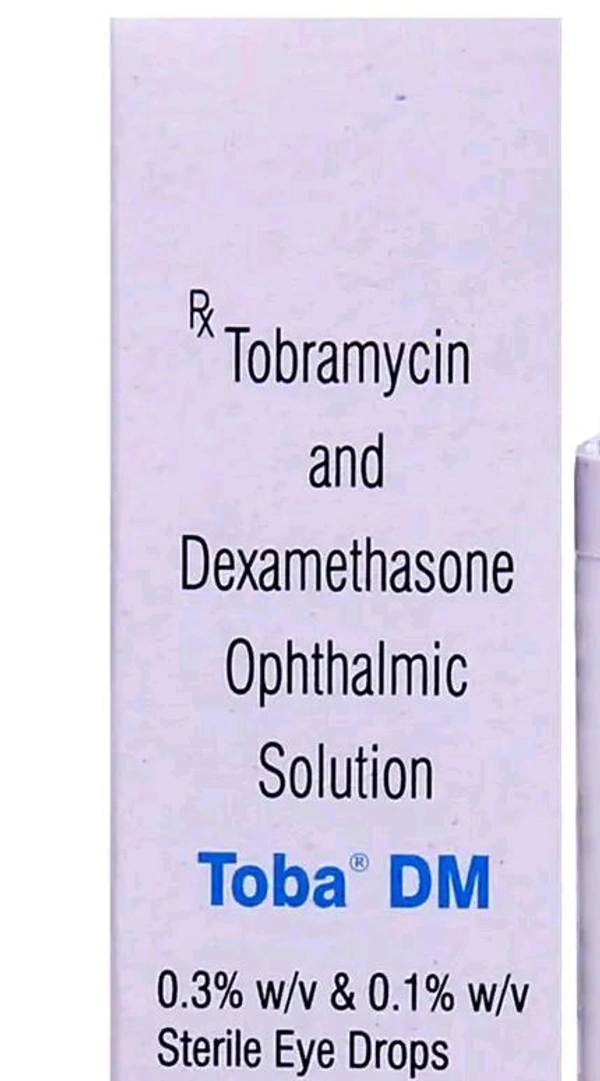 Toba DM Eye Drops is used to treat bacterial eye and ear infections. It is used to treat eye infections such as conjunctivitis (infection of the outer white membrane of the eyeball) and corneal ulcers (ulcer that occurs in the transplant membrane of the eye called the cornea). It contains Tobramycin and Dexamethasone, which kills bacteria and reduces swelling and redness. It may cause common side effects (when eye drops are used), including redness, itching, swelling, burning sensation, tearing, and temporary blurred vision (with ointment use). Before using this medicine, you should tell your doctor if you are allergic to any of its components or if you are pregnant/breastfeeding, and about all the medications you are taking and pre-existing medical conditions.
