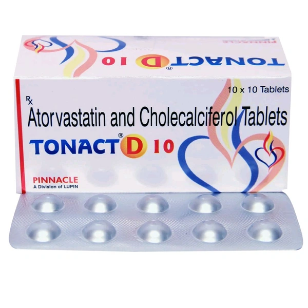 Tonact D 10 Tablet is a medicine used to treat high cholesterol. It is a combination of two medicines that reduces "bad" cholesterol (LDL) and triglycerides (fats) levels in the body. It may also reduce the risk of future heart attack and stroke.