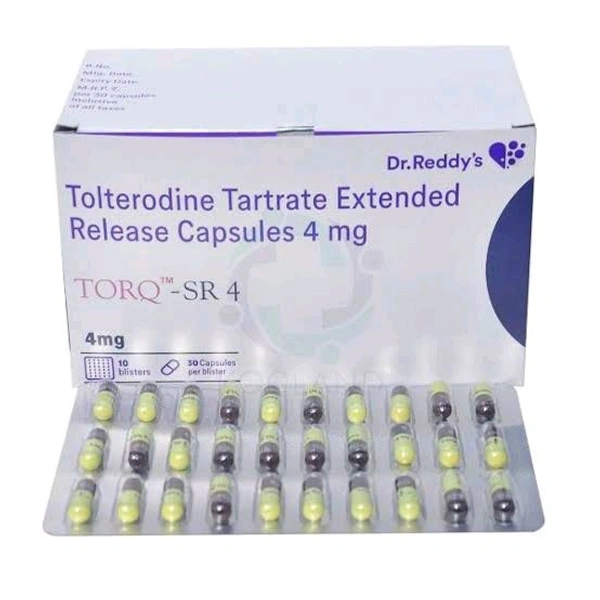 Torq SR 4 mg Capsule is used to treat overactive bladder (OAB) symptoms, including frequent urination, urgent need to urinate, and urge incontinence (inability to control urine). It contains Tolterodine, an antimuscarinic medication that relaxes bladder muscles, increasing storage capacity and reducing involuntary spasms