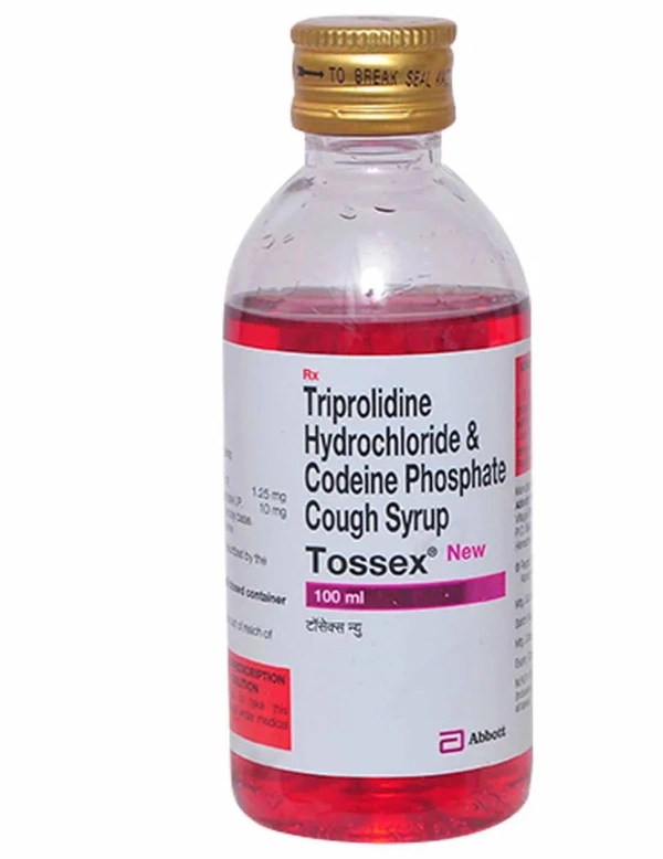Tossex New Syrup is used to treat dry cough. It contains Codeine and Triprolidine which work by blocking the receptor in the brain that produces cough and the action of histamine that causes allergic reactions. In some cases, this medicine may cause side effects such as drowsiness, dry mouth, vomiting, blurred vision, constipation, dizziness, or tiredness. Inform the doctor if you are pregnant or breastfeeding, taking any other medication, or have any pre-existing medical conditions.