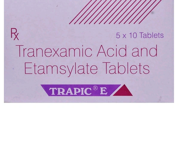 Trapic E Tablet is used to treat menorrhagia. It contains Tranexamic acid and Etamsylate, which increases the ability of platelets to stick together (platelet adhesion) and form blood clots and inhibits the action of chemical substances that cause the breakdown of platelets. Thus, helps to decrease abnormal bleeding. It may cause side-effects such as nausea, vomiting, diarrhea, stomach pain, fever, chills, rash, severe headache, back or joint pain, muscle pain, difficulty moving, and runny or stuffy nose. Before taking this medicine, you should tell your doctor if you are allergic to any of its components or if you are pregnant/breastfeeding, and about all the medications you are taking and pre-existing medical conditions.