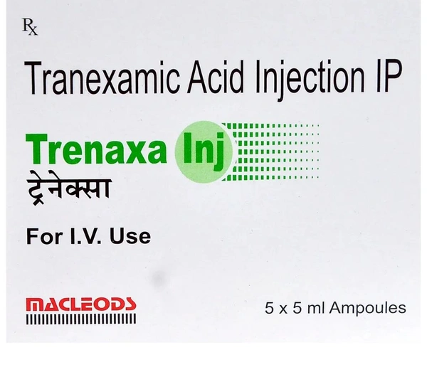Trenaxa Injection 5 ml is used to treat Abnormal heavy bleeding. It contains an anti-fibrinolytic drug, tranexamic acid, which helps the body's natural blood clotting system by reducing fibrin breakdown and inhibiting fibrinolysis, a process that limits the development of blood clots. As a result, it contributes to the prevention of excessive bleeding. Common side effects of Trenaxa Injection 5 ml include feeling sick (nausea), diarrhoea, vomiting, itchy skin, and pain at the injection site.