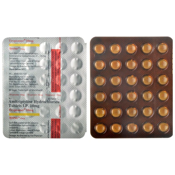 Tryptomer 10 mg tablet, containing Amitriptyline, is a tricyclic antidepressant used to treat depression, chronic neuropathic pain, migraine prevention, and tension-type headaches. It helps balance brain chemicals (serotonin/norepinephrine) to improve mood, reduce pain signaling, and is sometimes used for pediatric bedwetting (6+ years).