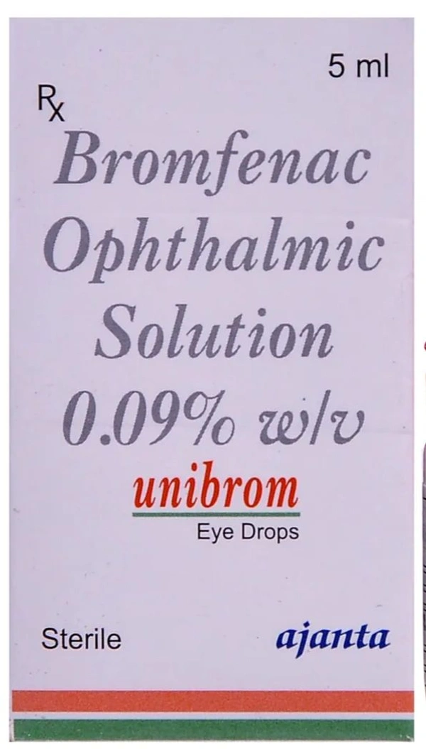 Unibrom Eye Drops 5 ml is used to reduce eye inflammation after cataract surgery in adults. It contains Bromfenac, which works by inhibiting the release of certain natural substances, such as prostaglandins in the eye, that cause pain and swelling. In some cases, you may experience mild eye irritation, headache, seeing floaters or flashes of light before the eyes, or increased sensitivity of the eyes to light. Before using this medicine, you should tell your doctor if you are allergic to any of its components or if you are pregnant/breastfeeding, and about all the medications you are taking and pre-existing medical conditions. You are advised to remove soft contact lenses before using this medicine as it may cause discolouration of the soft contact lens