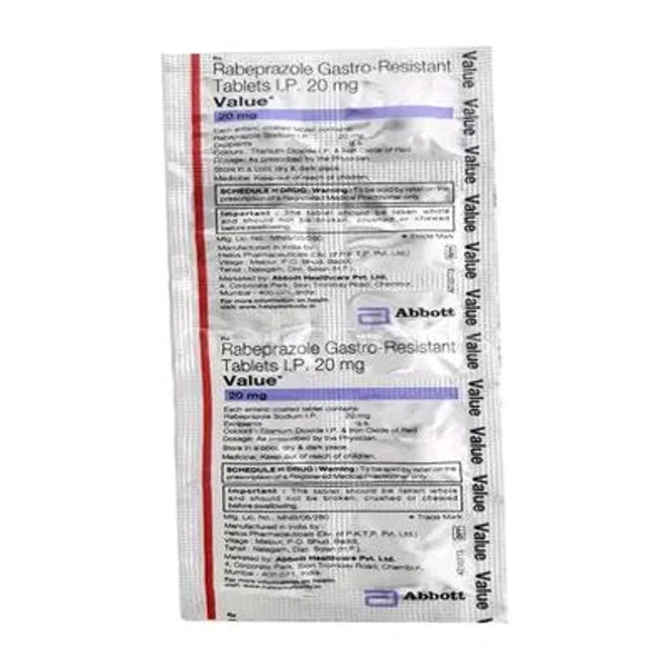 Value Tablet is used to treat duodenal ulcers, gastro-oesophageal reflux disease (reflux of gastric contents into the oesophagus), heartburn, erosive oesophagitis (acid-related damage to the lining of the oesophagus), infections caused by Helicobacter pylori when given along with an antibiotic, and Zollinger-Ellison syndrome. It contains Rabeprazole, which reduces acid production, heals the ulcers and prevents the formation of new ulcers. In some cases, you may experience certain common side effects such as headache, dizziness, diarrhoea, constipation, nausea, vomiting, flatulence (wind), weakness, and runny nose. Before taking this medicine, you should tell your doctor if you are allergic to any of its components or if you are pregnant/breastfeeding, and about all the medications you are taking and pre-existing medical conditions.