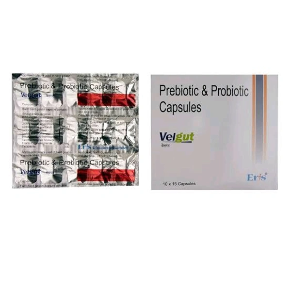 Velgut is a prebiotic and probiotic supplement, typically containing Saccharomyces boulardii and Fructooligosaccharides (FOS), used to improve digestive health, treat diarrhea (acute, chronic, or antibiotic-associated), and manage IBS. It restores healthy gut bacteria, reduces bloating and gas, and strengthens intestinal immunity.