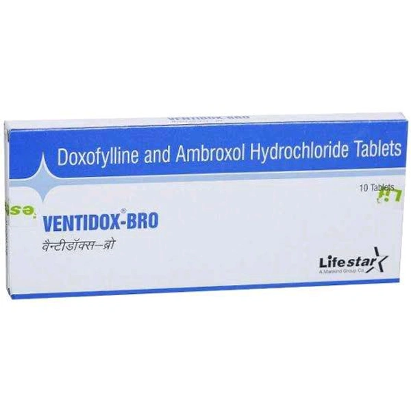 Ventidox-Bro Tablet is used to treat cough associated with respiratory disorders like asthma and chronic obstructive pulmonary disease (COPD). It contains Doxofylline and Ambroxol which work by relaxing and widening the muscles of the airways, making it easier to breathe. In some cases, this medicine may cause side effects such as nausea, taste change, stomach pain, photosensitivity, and numbness in the mouth, tongue, and throat. Inform the doctor if you are pregnant or breastfeeding, taking any other medication, or have any pre-existing medical conditions.