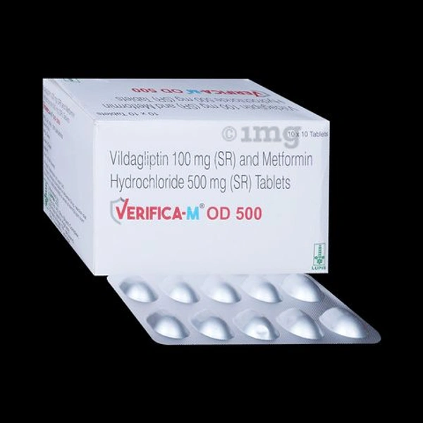 Verifica-M OD 500 Tablet SR is a combination of two medicines that control high blood sugar levels in people with type 2 diabetes mellitus. This helps prevent serious complications of diabetes such as kidney damage and blindness and may also reduce your chances of having a heart attack or stroke.