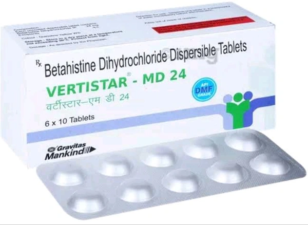 Vertistar-Md 24mg Tablet is used in the treatment of Meniere's disease and its symptoms including dizziness (vertigo), ringing in the ears (tinnitus), feeling sick (nausea), and difficulty in hearing. It contains Betahistine, which works by enhancing the blood flow to the affected part of the ear and also by reducing the amount of fluid in the inner ear. This drug also reduces the number of attacks a person can have. It may cause side effects such as nausea, indigestion (acid reflux), bloating or mild stomach ache, and headache. Before taking this medicine, you should tell your doctor if you are allergic to any of its components or if you are pregnant/breastfeeding, and about all the medications you are taking and pre-existing medical conditions.