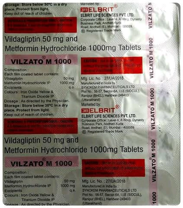 Vilzato M 1000 Tablet is a combination of two medicines that control high blood sugar levels in people with type 2 diabetes mellitus. This helps prevent serious complications of diabetes, such as kidney damage and blindness, and may also reduce your chances of having a heart attack or stroke.