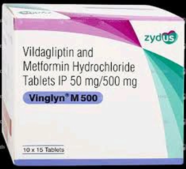 Vinglyn M 500 Tablet helps to control the blood sugar level. It works by making the pancreas produce more insulin and less glucagon (effect of vildagliptin) and also by helping the body to make better use of the insulin it has (effect of metformin).