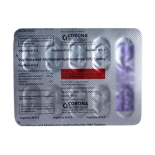 Voglibite M 0.3 Tablet is used in the treatment of type 2 diabetes mellitus. It contains Voglibose and Metformin, which work by lowering sugar production in the liver, increasing the body's sensitivity to insulin, and slowing the absorption of carbohydrates. It may cause common side effects such as nausea, vomiting, changes in taste, diarrhoea, stomach pain, and loss of appetite. Before taking this medicine, you should tell your doctor if you are allergic to any of its components or if you are pregnant/breastfeeding, and about all the medications you are taking and pre-existing medical conditions.