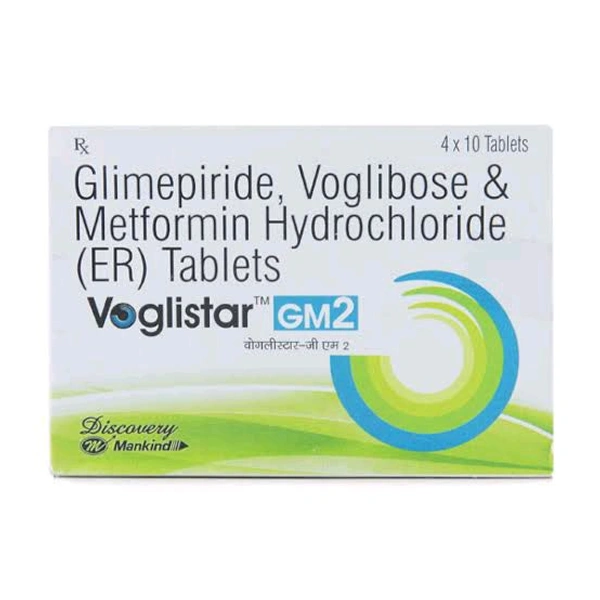 Voglistar GM2 Tablet is used to treat type 2 diabetes mellitus. It acts by increasing the amount of insulin released by the pancreas. Thus, prevent the blood glucose levels from rising to very high levels and keeps your diabetes under control. It may cause certain common side effects such as hypoglycaemia (low blood glucose levels), taste change, nausea, diarrhoea, stomach pain, headache, and upper respiratory symptoms. Before taking this medicine, you should tell your doctor if you are allergic to any of its components or if you are pregnant/breastfeeding, and about all the medications you are taking and pre-existing medical conditions.