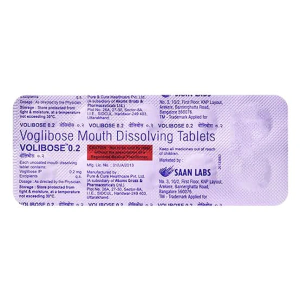 Volibose 0.2 mg Tablet is used to treat type-2 diabetes mellitus when diet and exercise alone cannot control blood sugar levels. It contains Voglibose, which works by inhibiting the intestinal enzymes responsible for breaking complex sugars into simple sugars like glucose. Thereby, it helps in preventing blood glucose levels from rising immediately after meals. In some cases, it may cause common side effects such as abdominal pain, diarrhoea, flatulence (gas), skin reactions, heartburn, nausea, and vomiting. Before taking this medicine, you should tell your doctor if you are allergic to any of its components or if you are pregnant/breastfeeding, and about all the medications you are taking and pre-existing medical conditions.