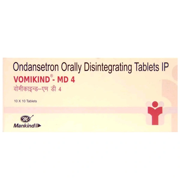 Vomikind MD 4 Tablet is used in the prevention of vomiting and nausea that usually occur after cancer chemotherapy, radiation treatment or surgery. It contains Ondanestron, which works by blocking the action of a chemical in the body (serotonin) responsible for causing nausea and vomiting. It may cause side effects such as feeling of warmth, constipation, headache, diarrhoea, headache, drowsiness, feeling of tiredness. Before taking this medicine, you should tell your doctor if you are allergic to any of its components or if you are pregnant/breastfeeding, and about all the medications you are taking and pre-existing medical conditions